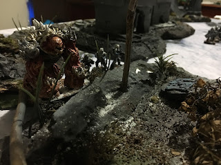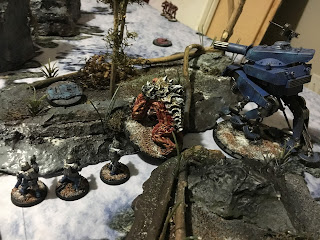 First things first, board set up...... done by both players rolling for terrain density for each deployment area and the area of conflict (center of the board), and then taking turns placing terrain pieces. Board set up is very flexible, allowing terrain pieces to be next to each other creating very interesting boards and features.