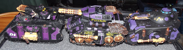 I just thought I would share my most recent Predator tank. I have yet to see one of this model used anywhere and it is a shame as it is nice stand in for a predator. It's a FMRIR tank from shieldwolf miniatures and after I finished it to where I was happy, I placed it next to the other two tanks I already have.It does show up how much better I am now than I was a few years ago (as well as the paint shades changing slightly which is the most visible on the purple portions of the models.) it does mean that I now have a project for after I finish my pile of stuff which is revisiting my older models in this army and giving them a spruce up.The FMRIR is a tad bit larger than the normal GW predator tanks and the FW Deimos variant but looks excellent all the same. In addition, the resin of the model was of good quality but once constructed did require some filling. If I do add more predator tanks in the future, I'll definitely get some more (and perhaps some of their rhino equivalents).-Kenneth