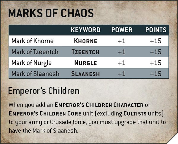 Codex: Chaos Space Marines is short moments away from escaping the Eye of Terror and racing to pre-order this weekend, and it’s full of diabolical new rules for making the army of your (most depraved) dreams.When fielding a Battle-forged army composed of any Chaos Space Marines Detachments, you can upgrade any CHAOS UNDIVIDED CORE or CHARACTER choice with a malefic Mark of Chaos for the appropriate points or Power Rating cost.Cultists do not get this luxury, as they are simply too low in the pecking order, whereas the new Daemon Prince must take a Mark of Chaos – they didn’t get those horns and spiky sentient cleavers without making a demonic deal.There is more small print too. You lose the CHAOS UNDIVIDED keyword, PSYKERS cannot take the Mark of Khorne for obvious reasons – though PRIESTS can* – Emperor’s Children units must have a Mark of Slaanesh, and you also need to give up your blackened and broken soul for all eternity.